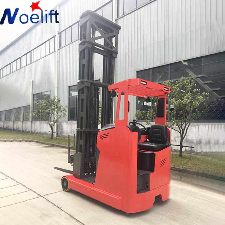 The noelift narrow aisle reach truck boasts exceptional lifting height, high load capacity, excellent visibility, and energy efficiency, making it ideal for warehouses with narrow aisles. This reach lift forklift features two outriggers to help distribute the load and a set of single wheels at the rear. This allows the operator to easily maneuver in and out of narrow aisles and reach greater heights while maintaining good lifting capacity.